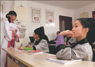 肖帜身着汉服,带领小学生齐声诵读国学启蒙读物《三字经》。 记者尤炼