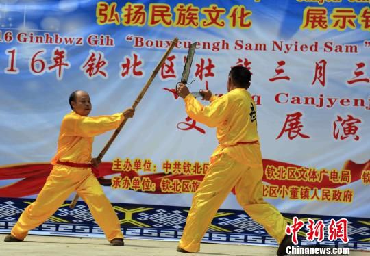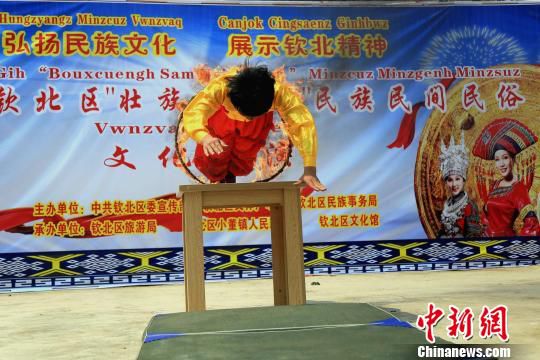 4月7日,广西钦州市各县区乡镇开展“壮族三月三”传统文化表演,以龙狮争斗,舞龙巡演,抛绣球 武术表演,穿火圈,山歌对唱等形式,丰富基层民众文化娱乐需求,更好地弘扬民族传统文化,为“壮族三月三”传统文化节的到来增添了许多节日气氛。据悉,每年的农历三月初三是壮族人民的传统节日,也称“歌圩节”。