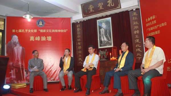 广东高科技产业商会执行会长王理宗先生、深圳市孔氏宗亲会会长孔涛先生发表主题演讲,并高度评价深圳孔圣堂和深圳孔子文化节在儒家文化复兴中的巨大贡献,期待深圳孔圣堂进一步推动儒家文化复兴事业!随后,参与高峰论坛的三和国际集团董事长张华先生、广东高科技产业商会执行会长王理宗先生、香港孔教学院副院长陈勇前先生、广东高科技产业商会副会长何明远先生等嘉宾就“儒家文化与精神信仰”主题进行了对话。对话结束后,与会嘉宾同观众进行了热烈的互动和讨论。
