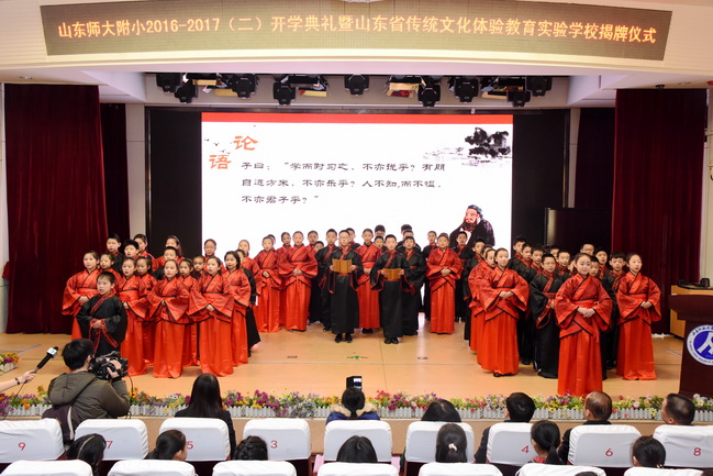 2月13日上午,山东师大附小“弘扬传统文化 经典润泽心田”2016至2017学年第二学期开学典礼暨山东省传统文化体验教育实验学校揭牌仪式在本部学术会堂举行。校长、党总支书记刘其彬,副校长刘松、潘恩群、肖宝民,党总支副书记张宁,校长助理刘贵华等出席活动,学校家委会代表、本部全体师生参加了开学典礼。