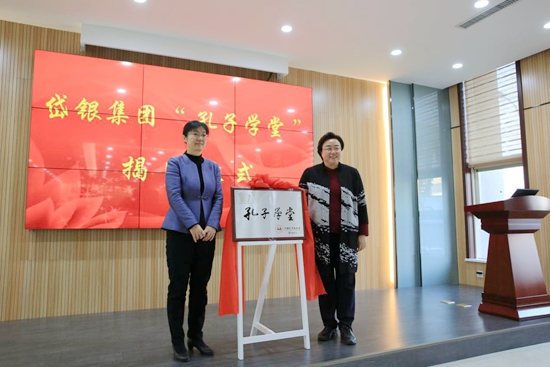 中国孔子基金会副秘书长周静(右)、泰安市副市长成丽共同为岱银集团“孔子学堂”揭牌
