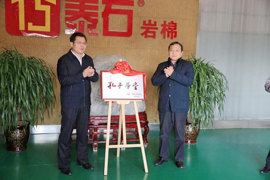 中国孔子基金会副秘书长刘廷善(右)、岱岳区政府副区长孙启龙共同为泰石岩棉股份有限公司“孔子学堂”揭牌