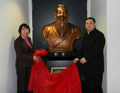 中国孔子基金会理事长梁国典(右)与奥克兰大学孔子学院姚载瑜院长共同为孔子像揭幕。