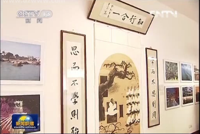 由中国孔子基金会选送的《孔子杏坛讲学图》高高的挂在刚果(布)古瓦比大学图书馆里。
