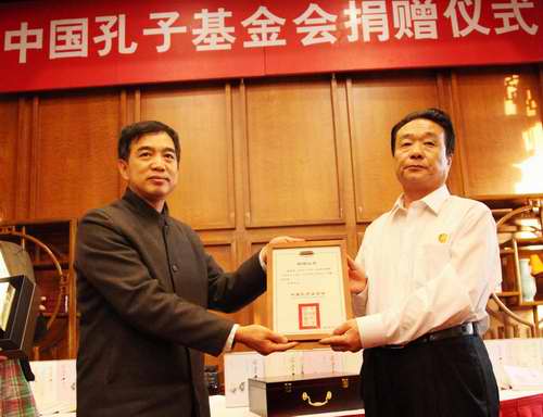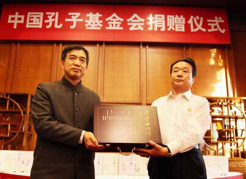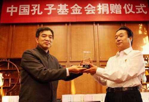 中国孔子基金会对外交流与合作委员会主任康承宝(左)接受捐赠