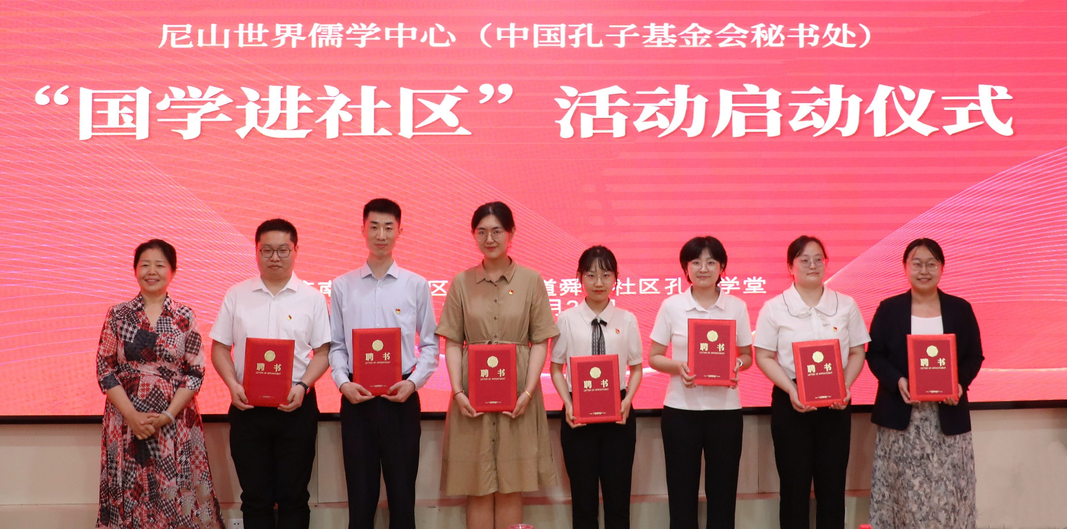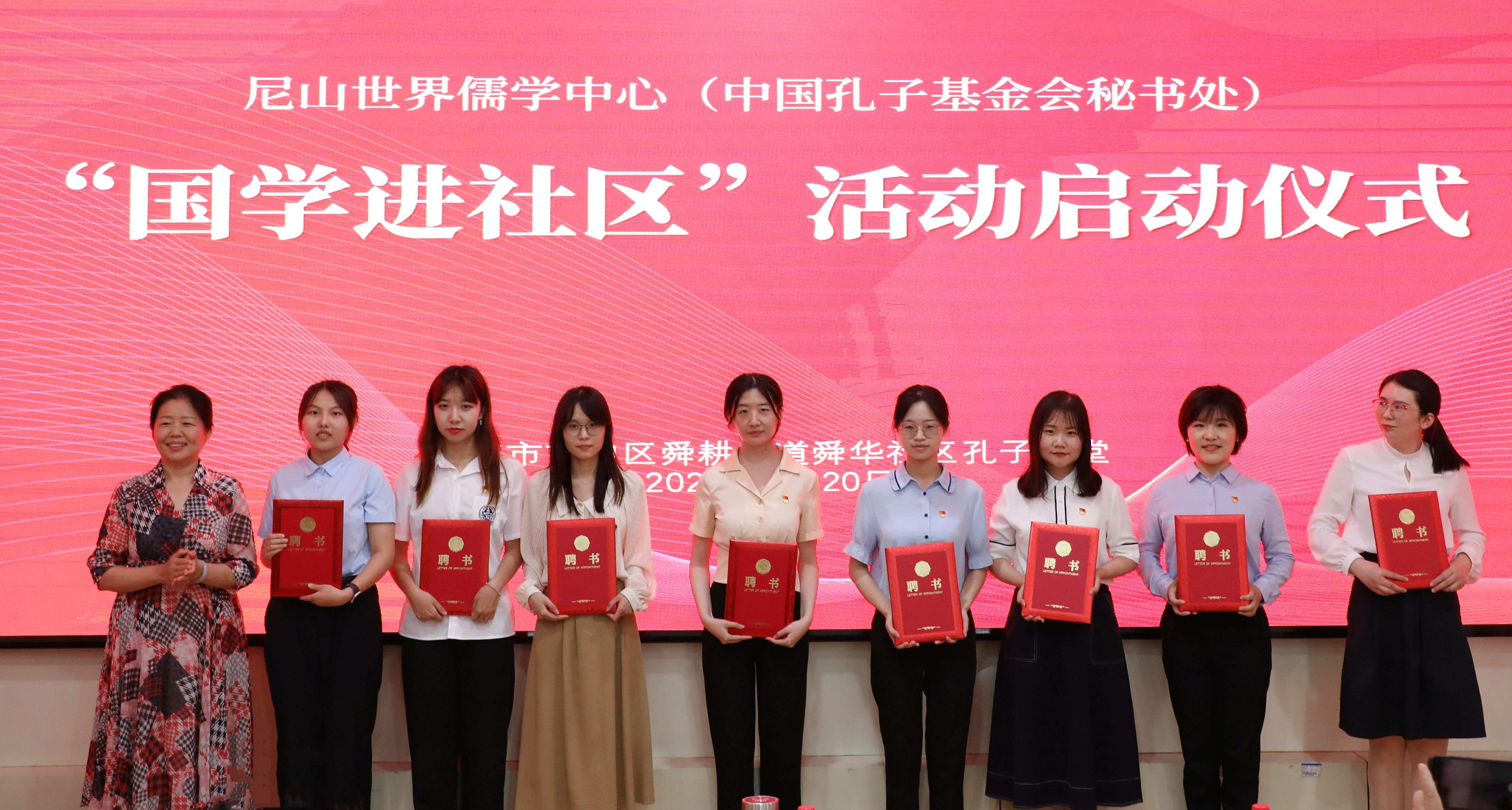 尼山世界儒学中心(中国孔子基金会秘书处)党委书记、副主任,中国孔子基金会副理事长、秘书长国承彦出席活动,并向舜华社区赠送国学书刊,为首批获聘“儒学中心青年志愿讲师”的青年干部颁发聘书。