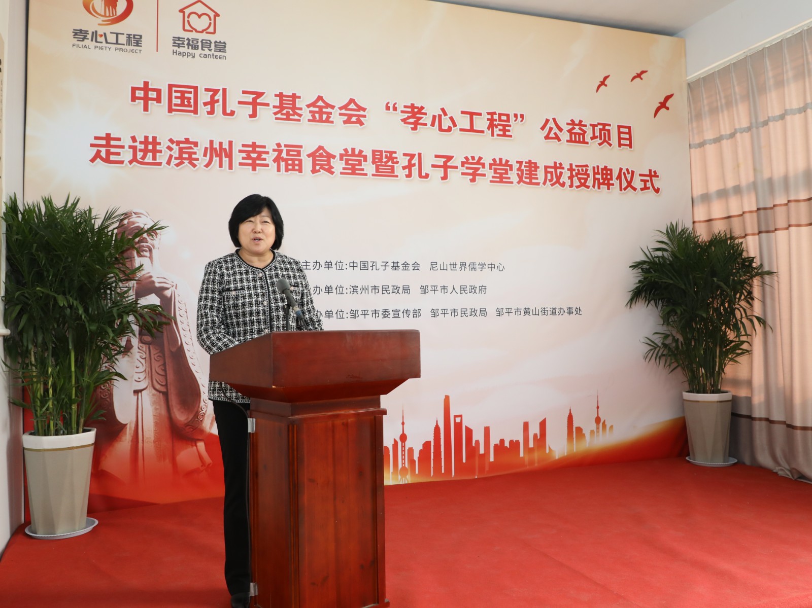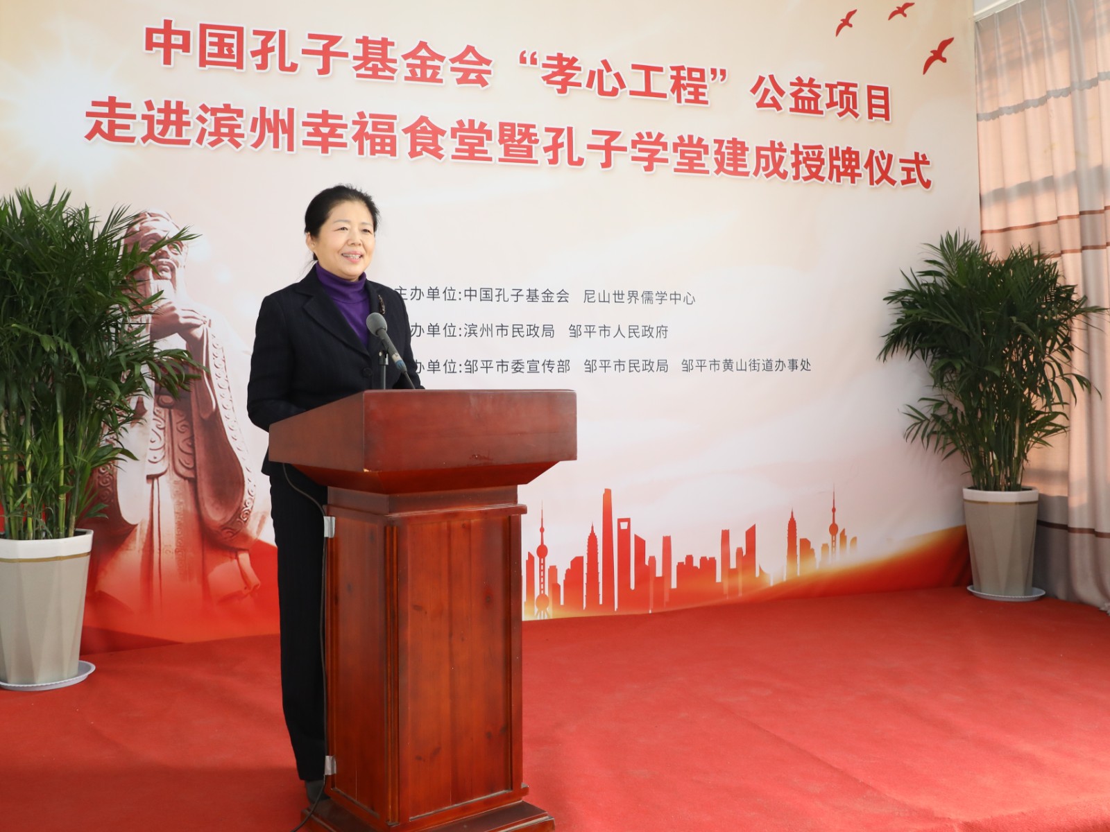 国承彦在致辞中指出,作为传承弘扬中华优秀传统文化的重要阵地,尼山世界儒学中心、中国孔子基金会创新实施了一系列文化品牌项目,设立中华优秀传统文化专项课题,出版《尼山文库》《尼山丛书》,成立联合研究生院,高质量出版《孔子研究》,创建孔子学堂、孝心工程公益项目。“孝心工程·幸福食堂”项目解决了老年人的就餐问题,让更多老年人过上老有所养的幸福生活。孔子学堂通过传习经典、举办公益公开课、交流培训等方式,传承和弘扬中华优秀传统文化。她表示,滨州市高度重视老龄工作,积极推动基本养老模式创新,构建了独具滨州特色的养老服务体系。邹平市充分发挥民政政策规范指导作用,推动养老需求与慈善捐赠有效衔接,大幅提升养老服务质量。尼山世界儒学中心、中国孔子基金会愿与滨州市一道,建设好、运营好“幸福食堂”,满足民生需求,增强基层凝聚力,探索建立接地气、可持续、可推广的农村养老新模式。把孔子学堂与幸福食堂项目同步规划、同步建设、同步运行,传播弘扬中华优秀传统文化,助力乡村基层治理,打造敬老孝亲、乡村振兴“齐鲁样板”,全方位提升乡村的文化氛围和精神面貌。