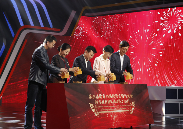 领导嘉宾共同启印,开启“第三届儒家经典跨语言诵读大会(中华经典国际诵读接力活动)”