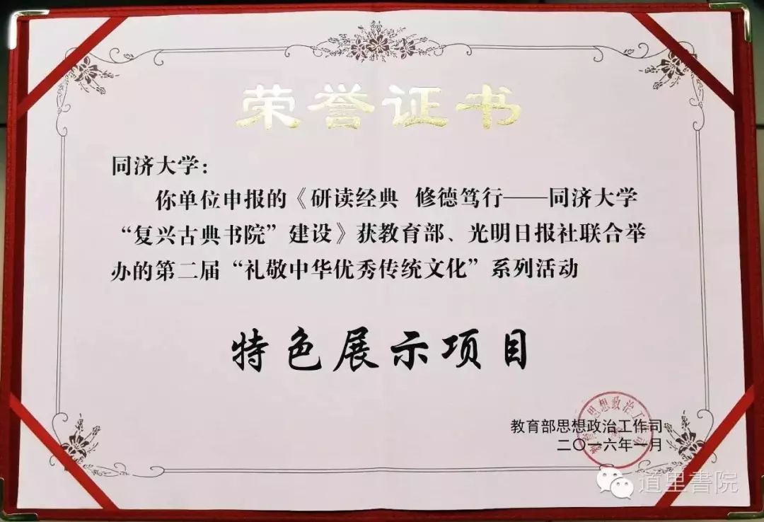 之所以选择同济复兴古典书院为例,是因为该书院是体制内机构办古典教育的最早先行者之一,相对于很多现代书院而言,它有较长的发展历史。最早在网络上开展语音读书会,后又落实到实体书院。经过多年的探索与发展,它已成为上海这座大都市最具影响力的书院,积累了一定经验,也取得了不俗成绩,曾被《人民日报》、儒家网等众多媒体报道。2016年“研读经典修德笃行——同济大学‘复兴古典书院’建设”项目还得到了教育部和《光明日报》联合举办的“礼敬中华优秀传统文化”系列活动的“特色展示项目”奖。古代书院的讲学、藏书、祭祀和学田四大规制,同济复兴古典书院都有一定程度的继承与发展。该书院有固定课程、兴趣小组和定期会讲,还有著作出版、游学雅集和参与祭祀等活动,并且发展了自己的微店,形成了一套相对完整的系统与机制。
