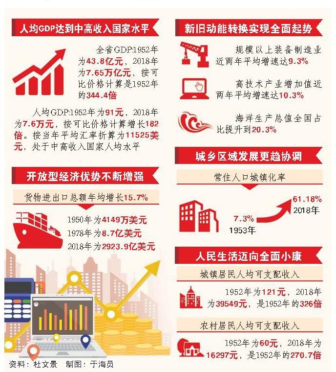 全省生产总值由1952年的43.8亿元提升到2018年的7.65万亿元,按可比价格计算是1952年的344.4倍;现在我省1天创造的财富量,相当于1952年全年的4.8倍……70年栉风沐雨,在中国共产党的坚强领导下,齐鲁大地发生了翻天覆地的变化,全省经济社会发展实现历史性跨越。特别是党的十八大以来,山东坚深入贯彻习总书记视察山东重要讲话、重要指示批示精神,践行新发展理念,实施新旧动能转换、乡村振兴、海洋强省、三大攻坚战、军民融合、打造对外开放新高地、区域协调发展、重大基础设施建设八大发展战略,新时代现代化强省建设迈出坚实步伐。