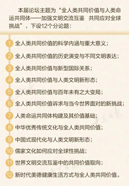 自2010年创办以来,每届尼山论坛都聚焦当下人们普遍关心的共同话题,精心提炼设置主题。今年论坛主题为“全人类共同价值与人类命运共同体——加强文明交流互鉴 共同应对全球挑战”,同时设置12个分议题供专家学者研讨交流。
