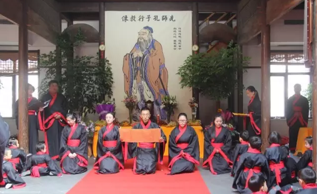 祭祖祭孔典礼之后,由家长带领孩子向老师行谢师礼,校长代诸师为同学们训教。愿我们的学子,志道据德,依仁游艺,博文约礼,志在圣贤。然后学生面向家长行报恩礼,感恩父母的生育养育呵护之恩。